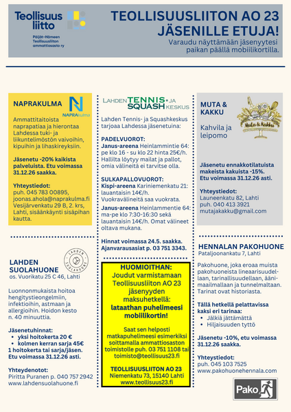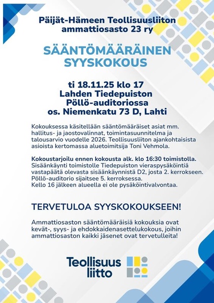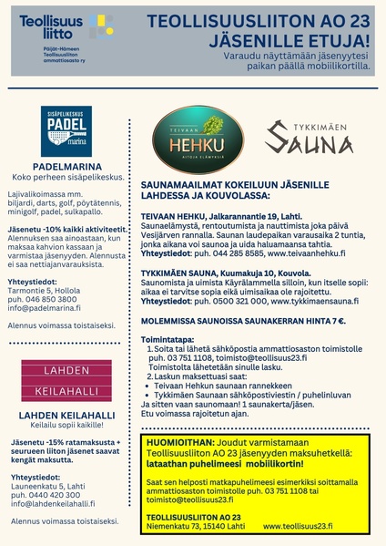 Teollisuus 23:n jäseneksi voit liittyä, kun työskentelet Päijät-Hämeen alueella alalla, jossa sovelletaan Teollisuusliittoon kuuluvaa työehtosopimusta.